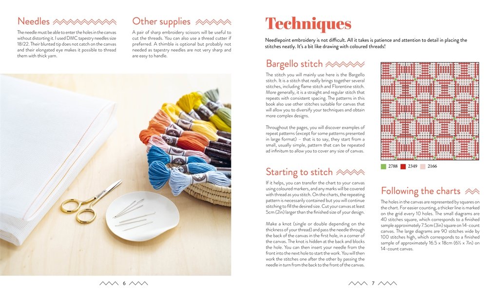 Techniken: Erlerne die wichtigsten Sticktechniken mit Schwerpunkt auf dem Bargello-Stich und seinen Variationen. Das Buch stellt auch andere an die Leinwand angepasste Stiche vor und zeigt, wie man Techniken für strukturierte und dimensionale Effekte kombiniert. Schritt-für-Schritt-Anleitungen machen es einfach, Muster anzupassen, Farben zu ändern und Motive für größere Projekte zu wiederholen.