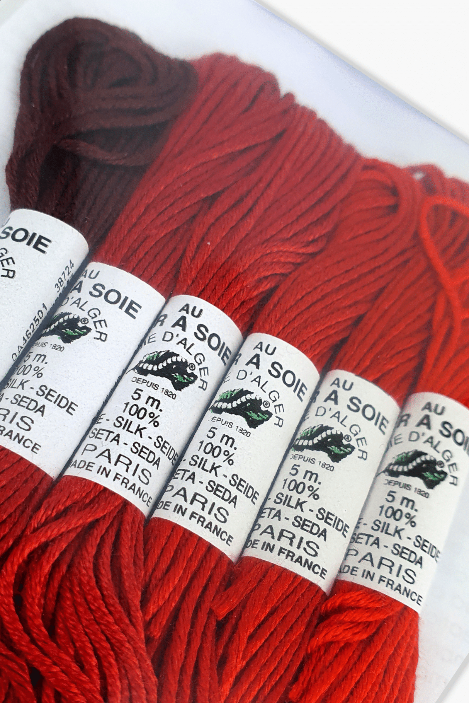 Au Ver à Soie Soie d’Alger Paris ist ein hochwertiges 7-fädiges gekämmtes Seidengarn aus Frankreich, das einen zarten Glanz, eine weiche Textur und eine außergewöhnliche Vielseitigkeit bietet. Dieser luxuriöse Faden lässt sich leicht in einzelne Stränge auftrennen und eignet sich daher perfekt für eine Vielzahl von Handarbeitstechniken. Jede Packung enthält sechs Stränge à 5 m in sorgfältig ausgewählten Rottönen, die sich ideal für harmonische Farbabstufungen eignen. Die genauen Farbtöne können von Packung zu Packung leicht variieren und bieten so eine einzigartige und inspirierende Farbpalette für jedes Projekt.