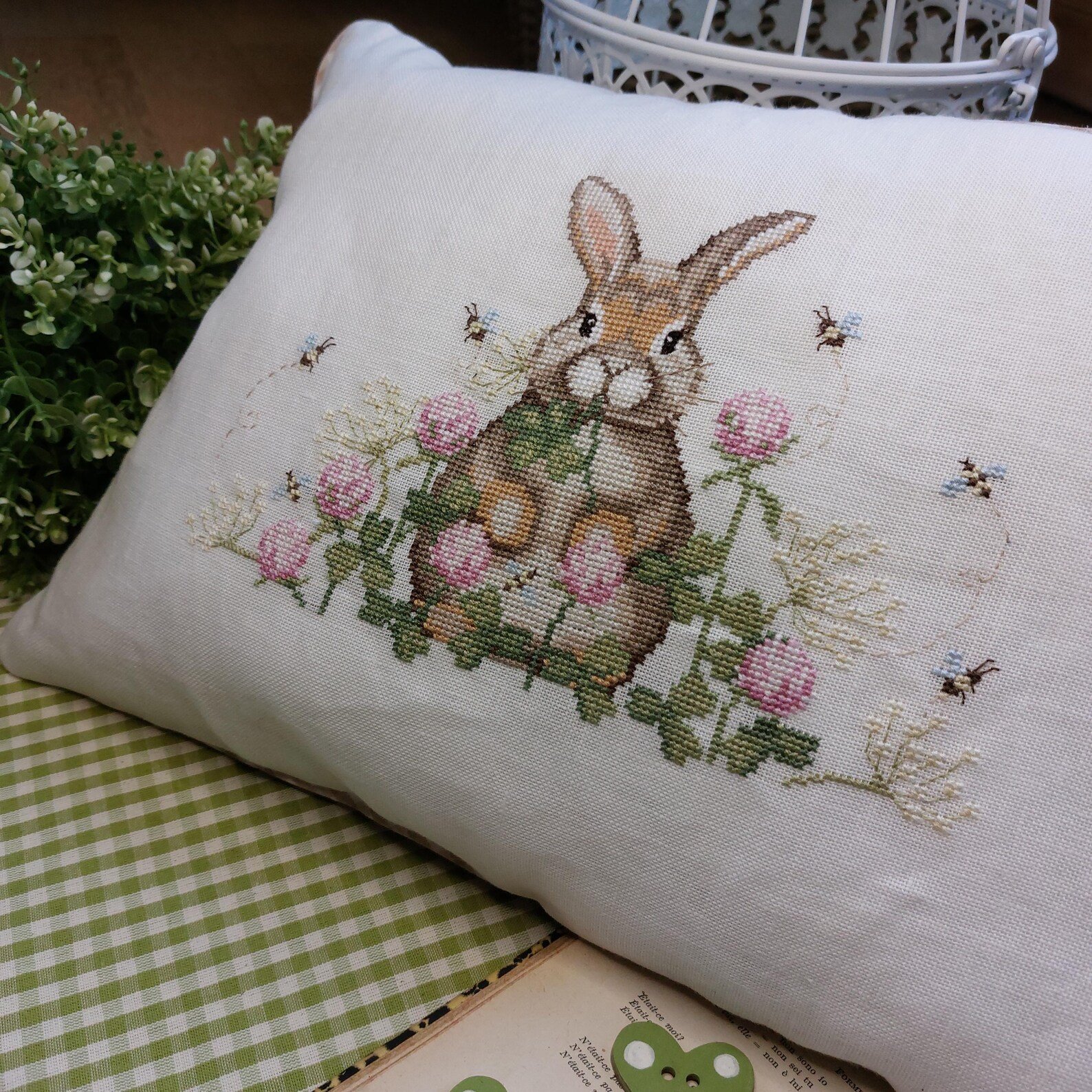 Das Muster zeigt einen Glückshasen in einem Feld aus rosa und weißem Klee, um dessen Blüten kleine Bienen schwirren. Dieses süße, rustikale Muster eignet sich perfekt zum Nähen eines kuscheligen Kissens oder eines gerahmten Stücks, um deinem Zuhause einen Hauch von Frühlingszauber zu verleihen.