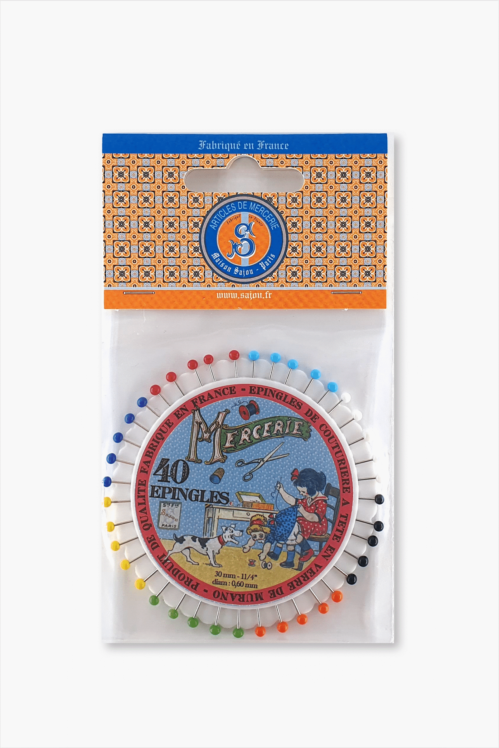 Diese bezaubernde Rosette enthält 40 Nähnadeln mit Glaskopf, die mit echtem Muranoglas verziert sind. Die Stecknadeln sind ordentlich auf einem drehbaren Rad angeordnet, das mit dem kultigen Nähmotiv des kleinen Mädchens von Maison Sajou verziert ist.
