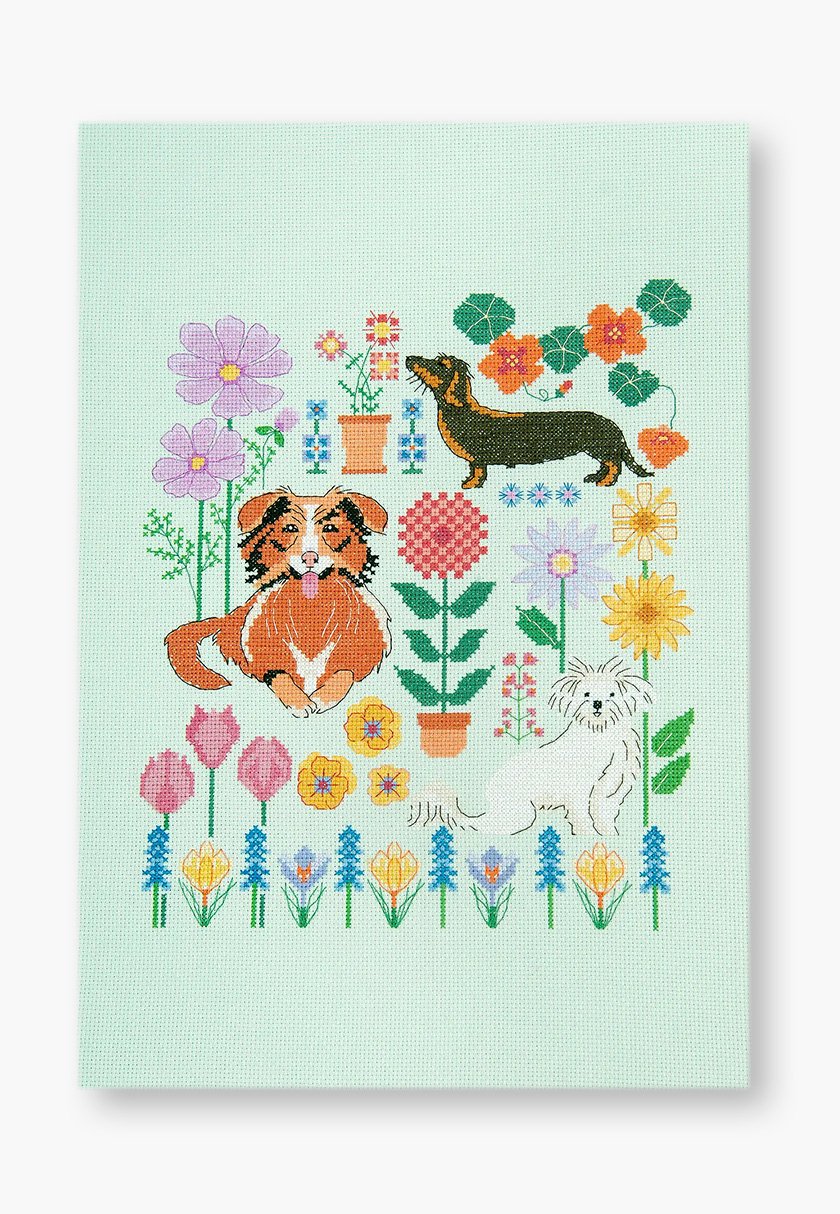 Conseils:Travaille avec un bon éclairage et garde le tissu bien tendu dans le cerceau pour obtenir des points réguliers. Suis attentivement le tableau des couleurs pour mettre en valeur les détails ludiques des chiens et l’éclat de la fleur sauvage