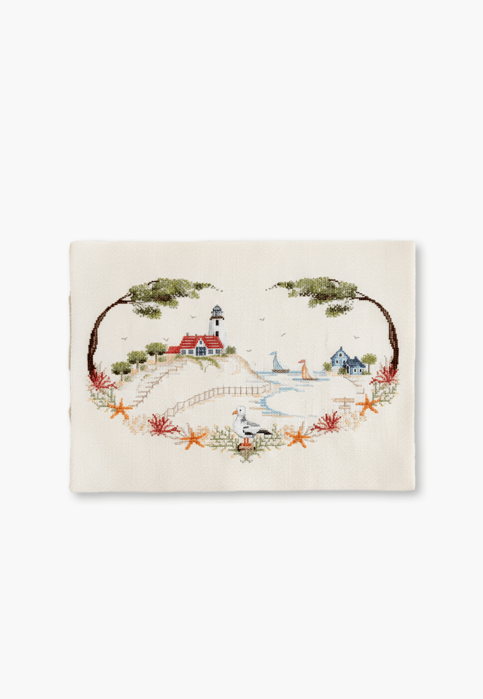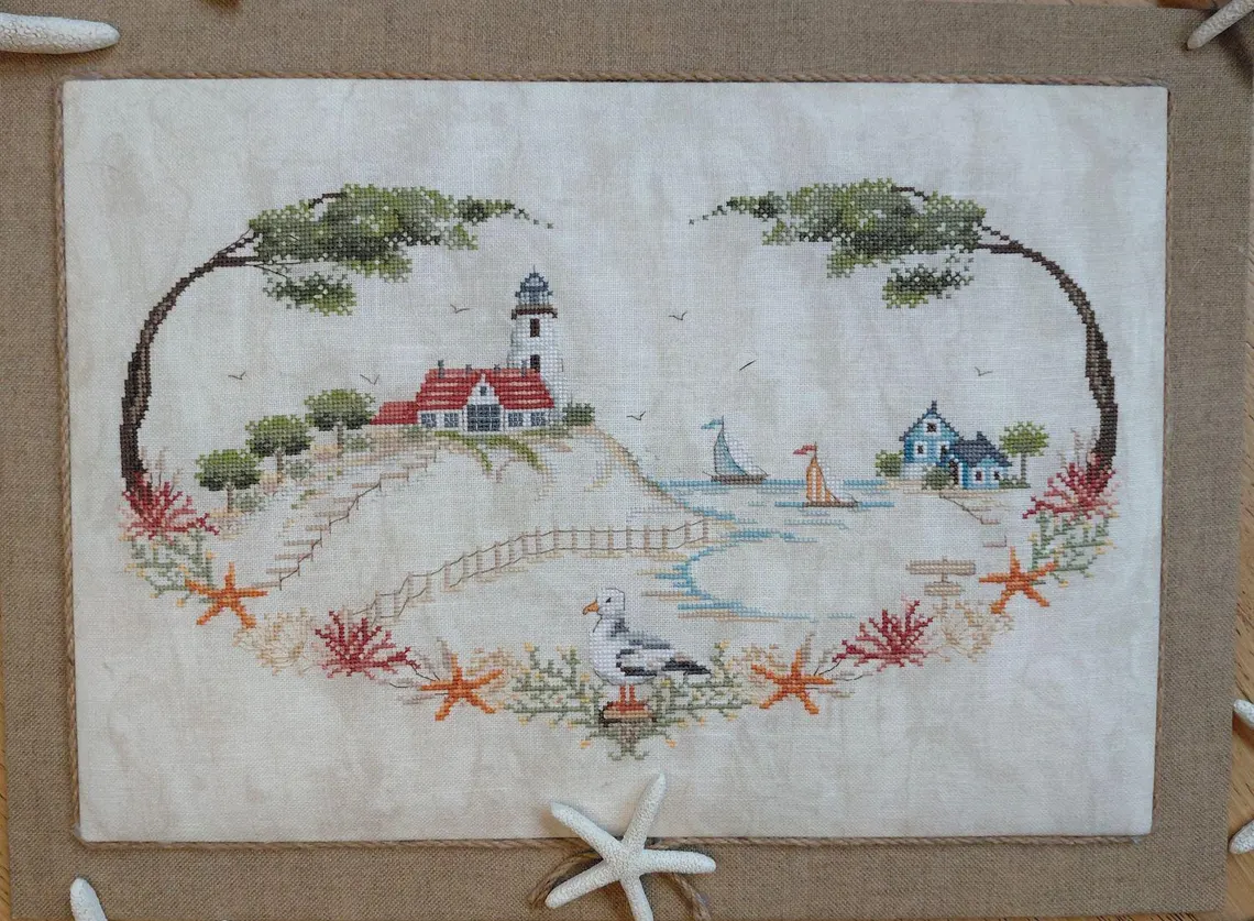 Capture le charme d’un paisible village de bord de mer avec cet élégant kit de motifs de point de croix. Le motif représente un phare perché sur une falaise, des voiliers glissant sur l’eau, des chalets de bord de mer douillets et une mouette gracieuse sur le rivage, le tout encadré par du corail, des étoiles de mer et des pins balayés par le vent.