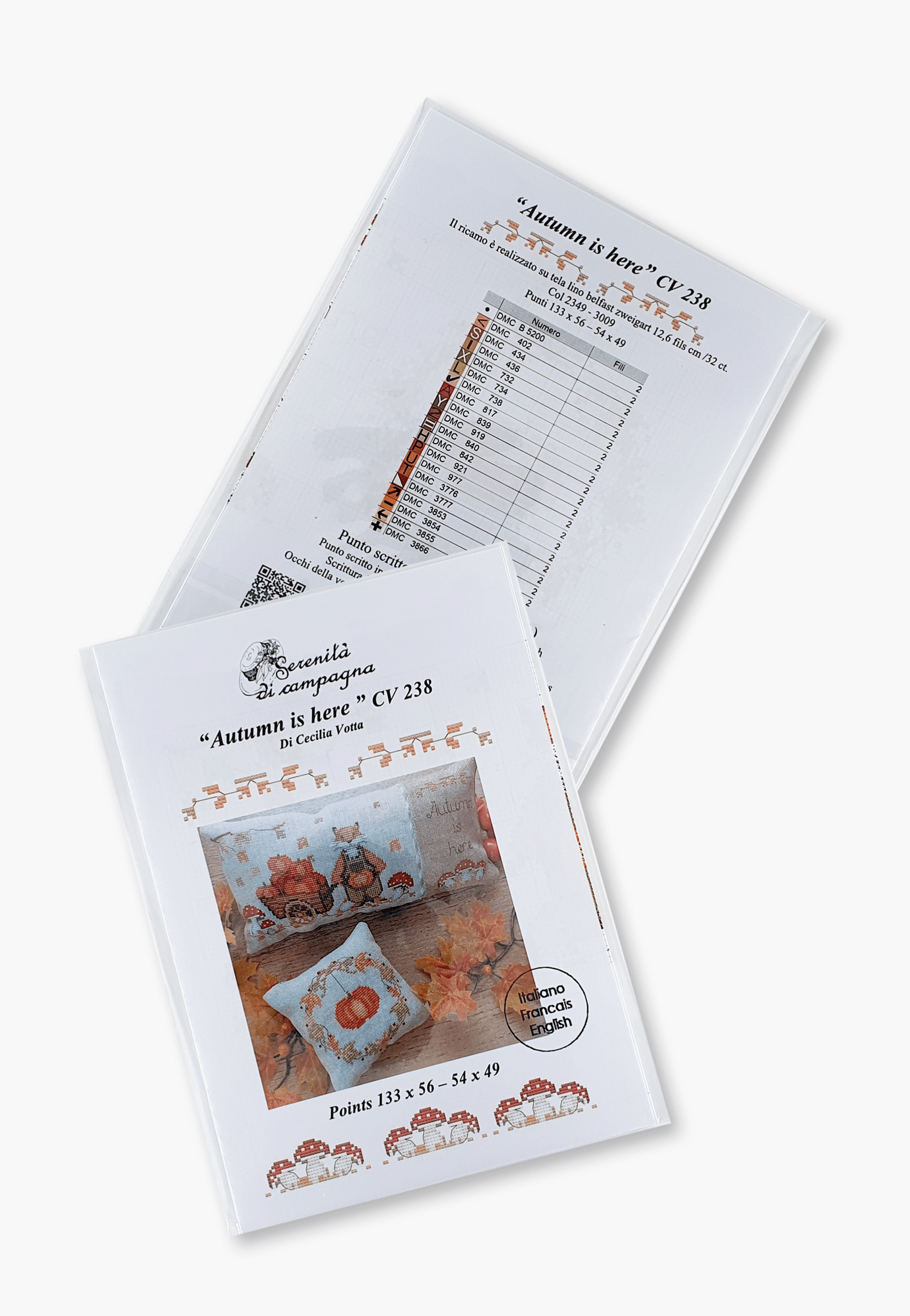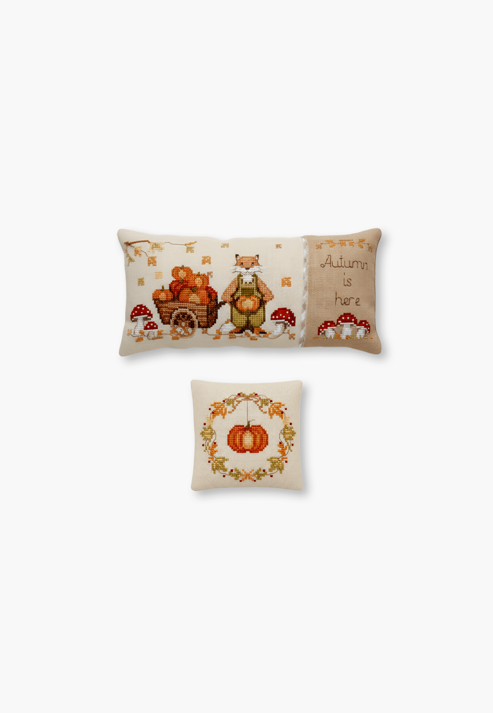 Célèbre l’esprit douillet de la saison avec cette charmante planche de point de croix. La planche fournit des patrons pour deux délicieux motifs d’automne : un coussin lombaire avec un renard fantaisiste poussant une brouette pleine de citrouilles et le texte “L’automne est là”, et un coussin carré plus petit avec une citrouille classique entourée d’une couronne de feuilles festives. Ces motifs complémentaires sont parfaits pour créer un étalage chaleureux et accueillant sur le thème de l’automne.