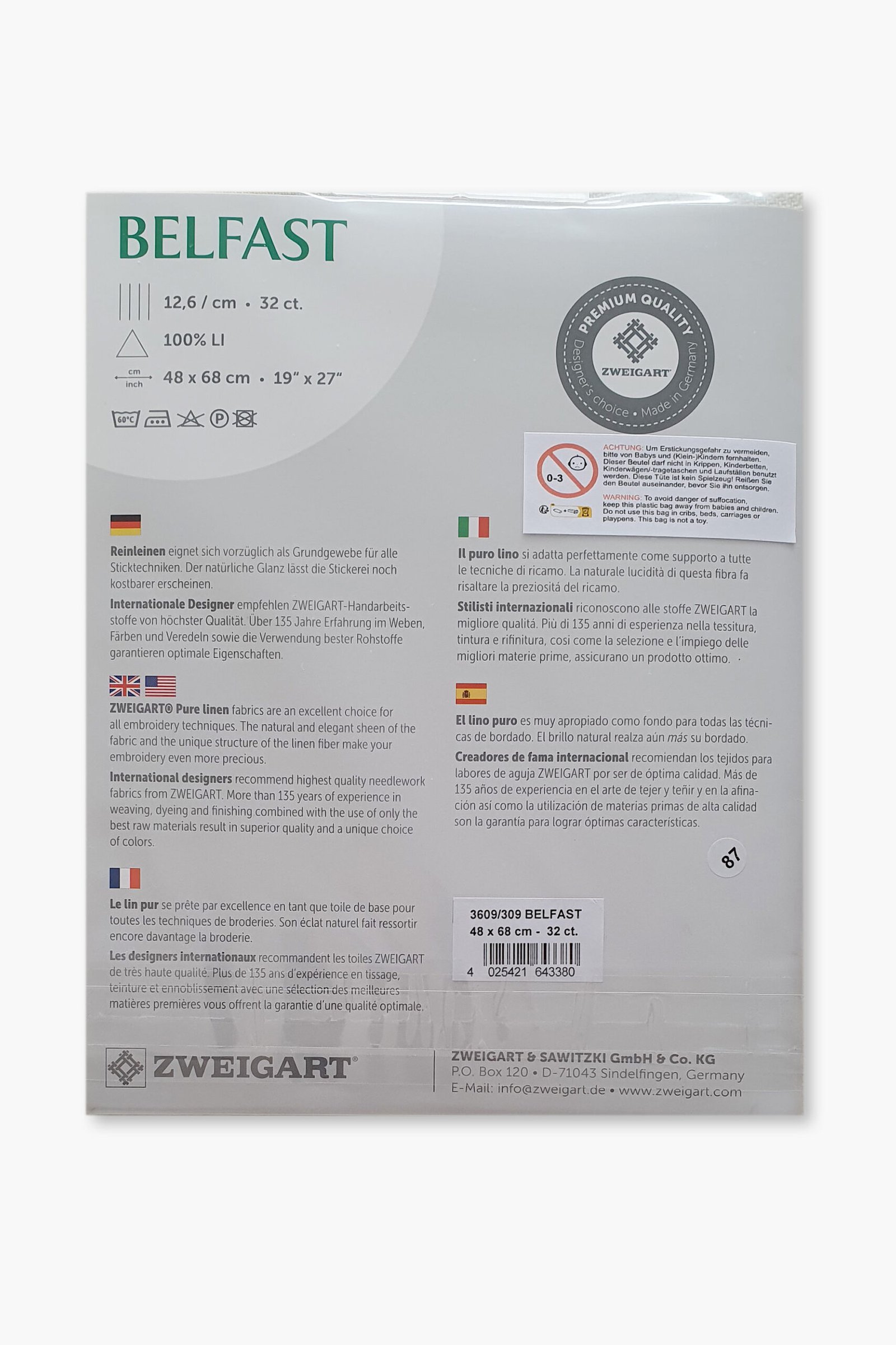Ogni pezzo è pretagliato a misura (48 × 68 cm) e confezionato singolarmente. La gamma Belfast è disponibile in una selezione accuratamente scelta di colori, pensati per completare sia i disegni di ricamo classici che quelli contemporanei. Prodotto da Zweigart, storica azienda tessile tedesca fondata nel 1877 e riconosciuta a livello internazionale per i suoi tessuti ricamati. Tutti i tessuti di lino Zweigart sono prodotti esclusivamente in Germania, utilizzando materie prime di alta qualità e processi produttivi controllati.