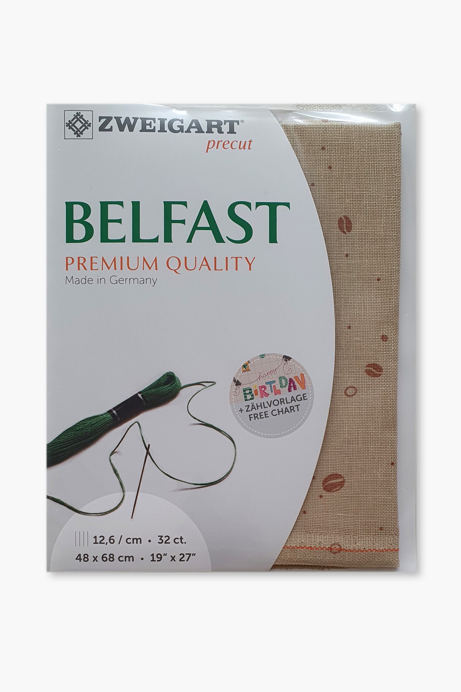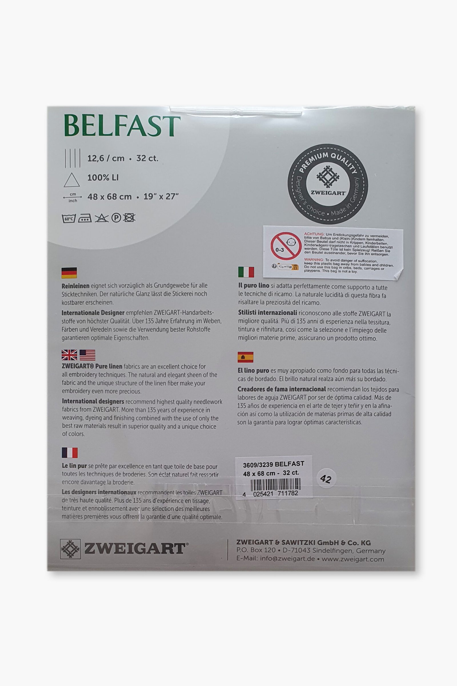 Ogni pezzo è pretagliato a misura (48 × 68 cm) e confezionato singolarmente. La gamma Belfast è disponibile in una selezione accuratamente scelta di colori, pensati per completare sia i disegni di ricamo classici che quelli contemporanei. Prodotto da Zweigart, storica azienda tessile tedesca fondata nel 1877 e riconosciuta a livello internazionale per i suoi tessuti ricamati. Tutti i tessuti di lino Zweigart sono prodotti esclusivamente in Germania, utilizzando materie prime di alta qualità e processi produttivi controllati.