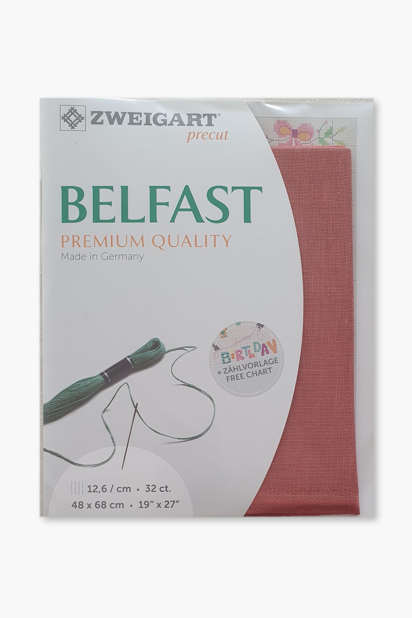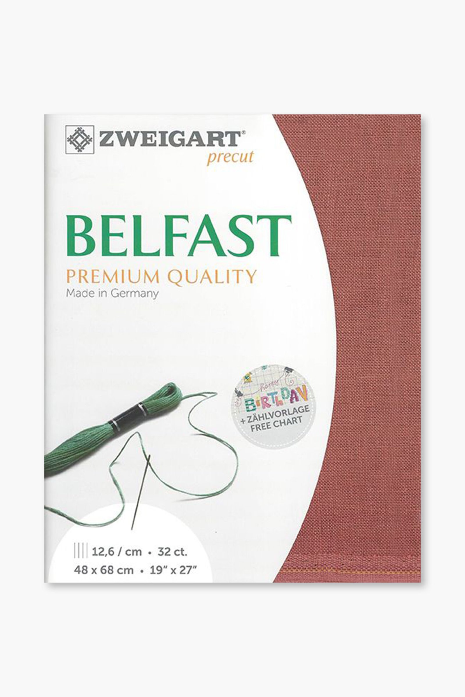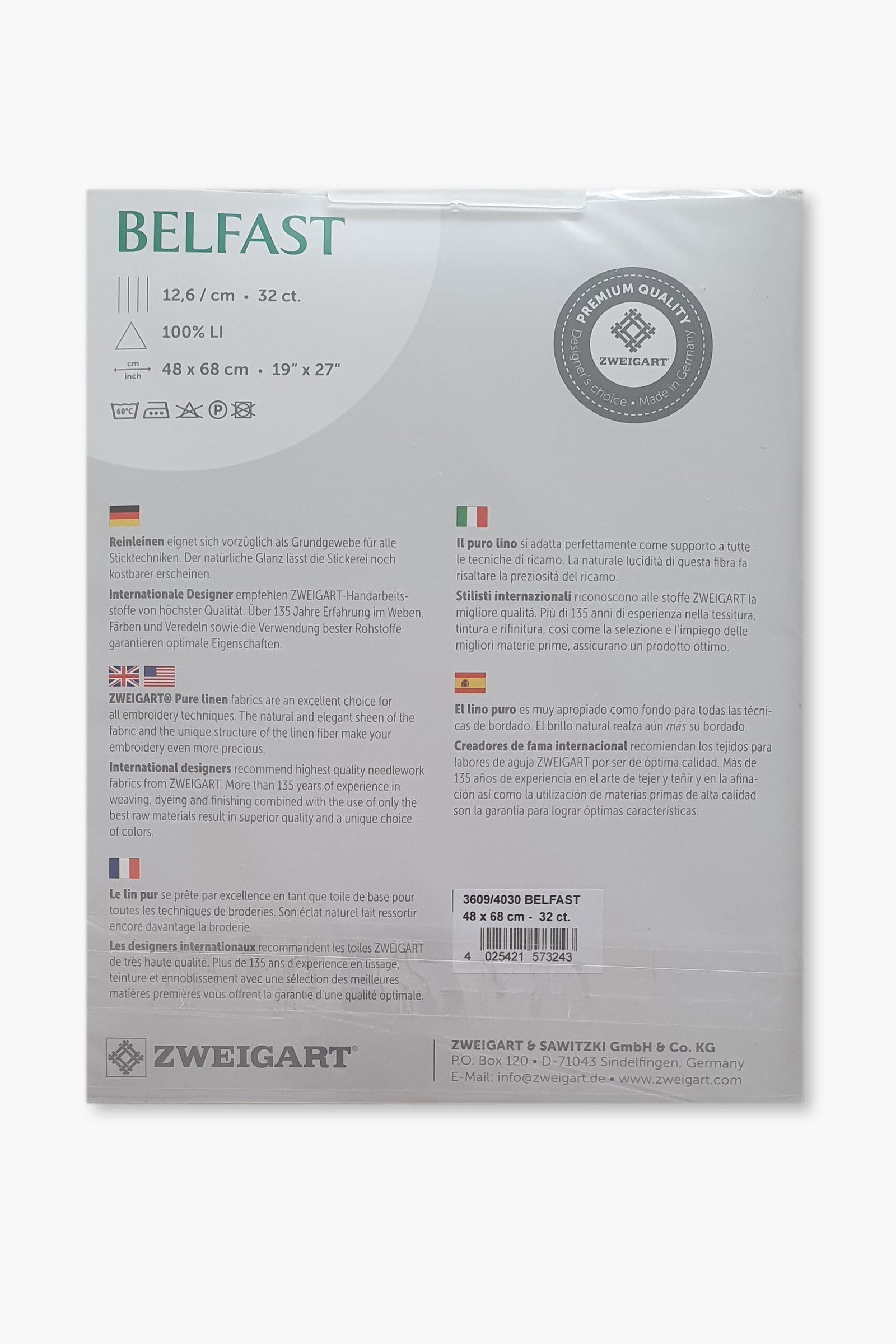 Ogni pezzo è pretagliato a misura (48 × 68 cm) e confezionato singolarmente. La gamma Belfast è disponibile in una selezione accuratamente scelta di colori, pensati per completare sia i disegni di ricamo classici che quelli contemporanei. Prodotto da Zweigart, storica azienda tessile tedesca fondata nel 1877 e riconosciuta a livello internazionale per i suoi tessuti ricamati. Tutti i tessuti di lino Zweigart sono prodotti esclusivamente in Germania, utilizzando materie prime di alta qualità e processi produttivi controllati.