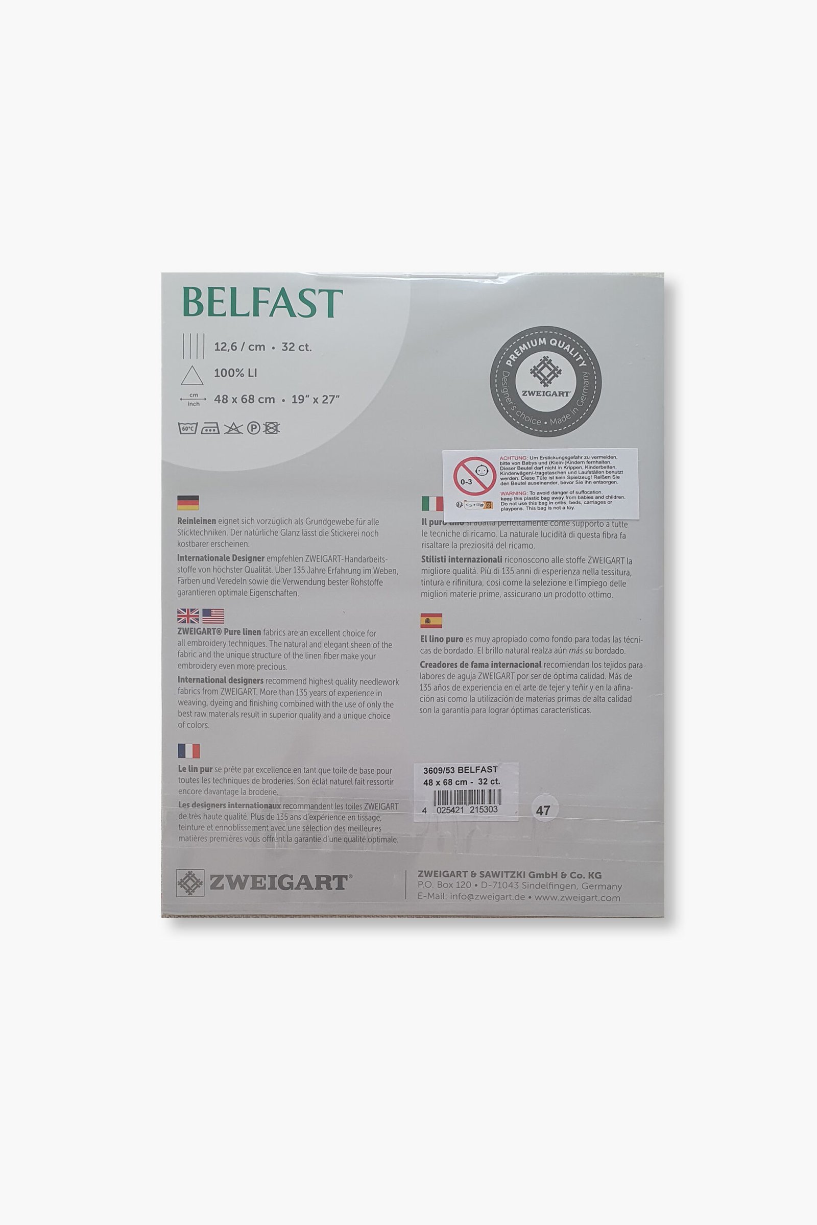 Prodotto da Zweigart, storica azienda tessile tedesca fondata nel 1877 e riconosciuta a livello internazionale per i suoi tessuti ricamati. Tutti i tessuti di lino Zweigart sono prodotti esclusivamente in Germania, utilizzando materie prime di alta qualità e processi produttivi controllati.