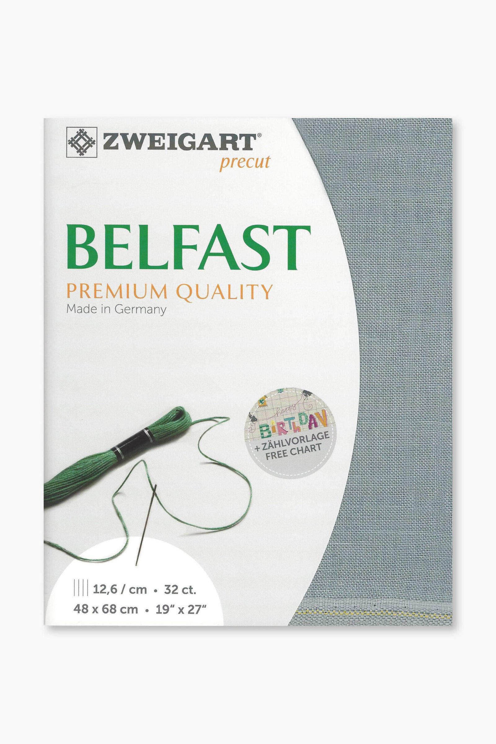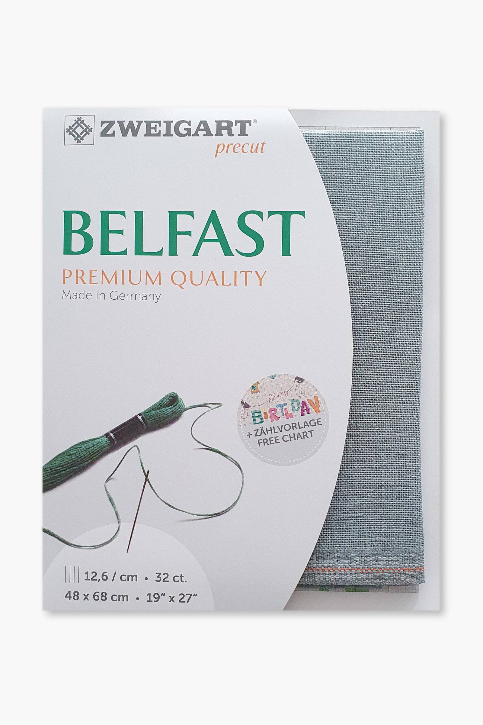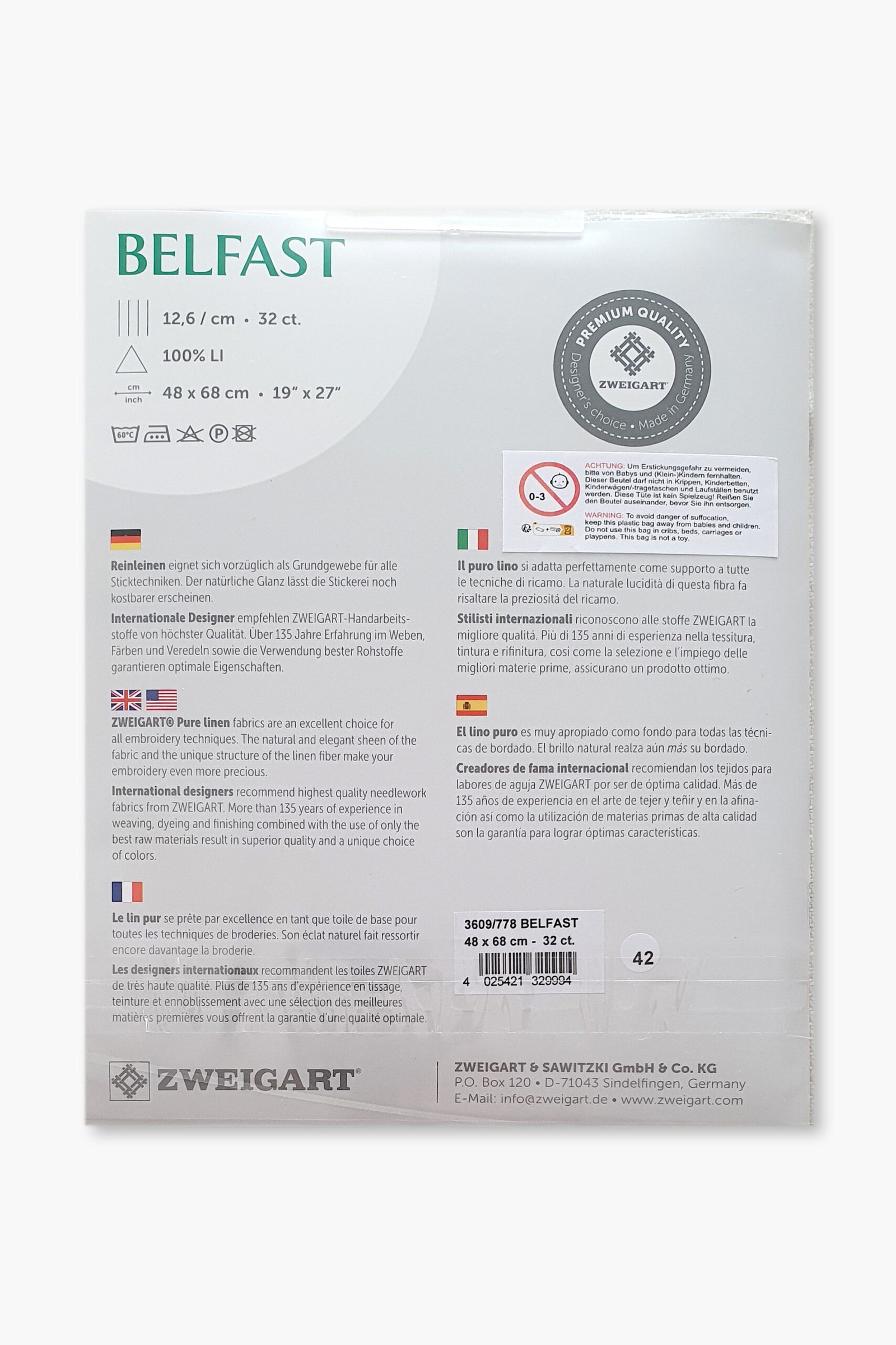 Ogni pezzo è pretagliato a misura (48 × 68 cm) e confezionato singolarmente. La gamma Belfast è disponibile in una selezione accuratamente scelta di colori, pensati per completare sia i disegni di ricamo classici che quelli contemporanei. Prodotto da Zweigart, storica azienda tessile tedesca fondata nel 1877 e riconosciuta a livello internazionale per i suoi tessuti ricamati. Tutti i tessuti di lino Zweigart sono prodotti esclusivamente in Germania, utilizzando materie prime di alta qualità e processi produttivi controllati.