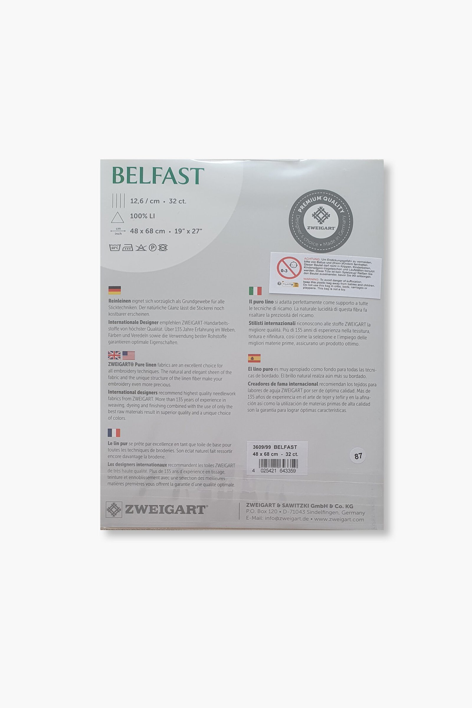Prodotto da Zweigart, storica azienda tessile tedesca fondata nel 1877 e riconosciuta a livello internazionale per i suoi tessuti ricamati. Tutti i tessuti di lino Zweigart sono prodotti esclusivamente in Germania, utilizzando materie prime di alta qualità e processi produttivi controllati.