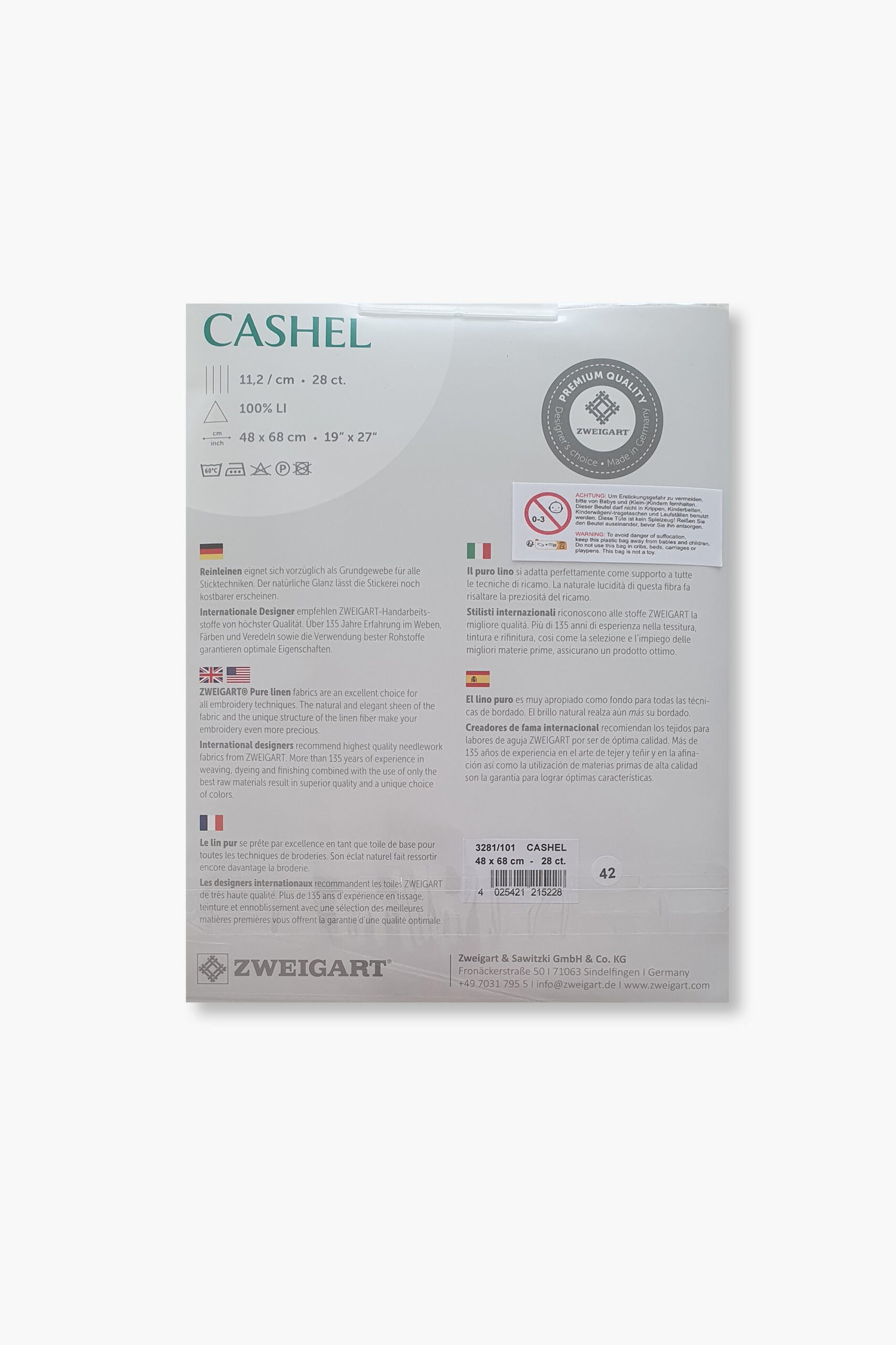 Prodotto da Zweigart, storica azienda tessile tedesca fondata nel 1877 e riconosciuta a livello internazionale per la qualità dei suoi tessuti da ricamo. Tutti i tessuti di lino Zweigart sono prodotti esclusivamente in Germania, utilizzando materie prime accuratamente selezionate e processi produttivi controllati.