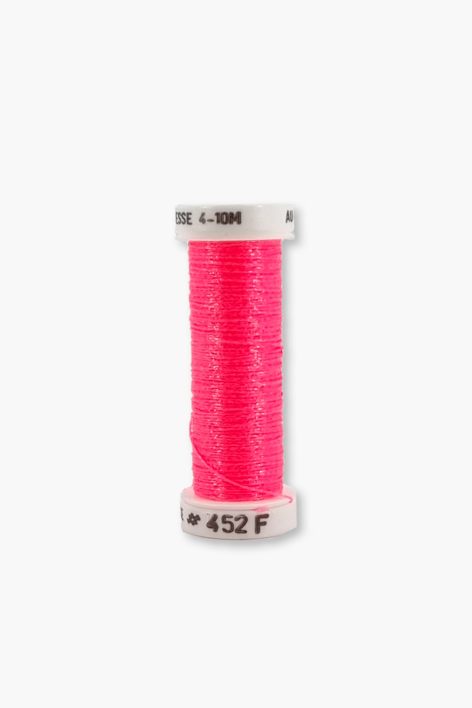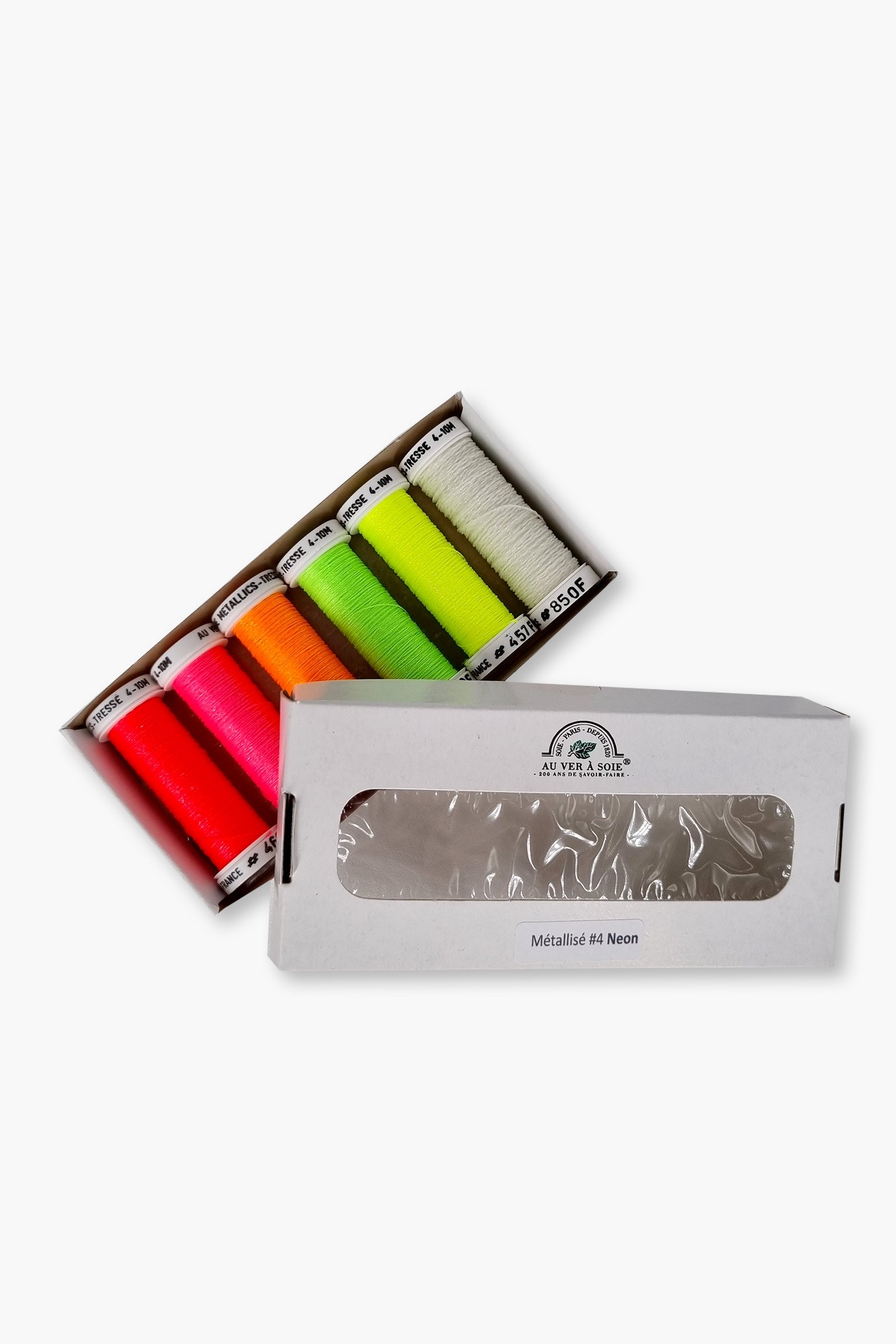 The “Neon” pack includes 6 spools in coordinated neon shades, designed for bold highlights and modern decorative accents. Each spool contains 10 meters of thread (4 brins tressés).