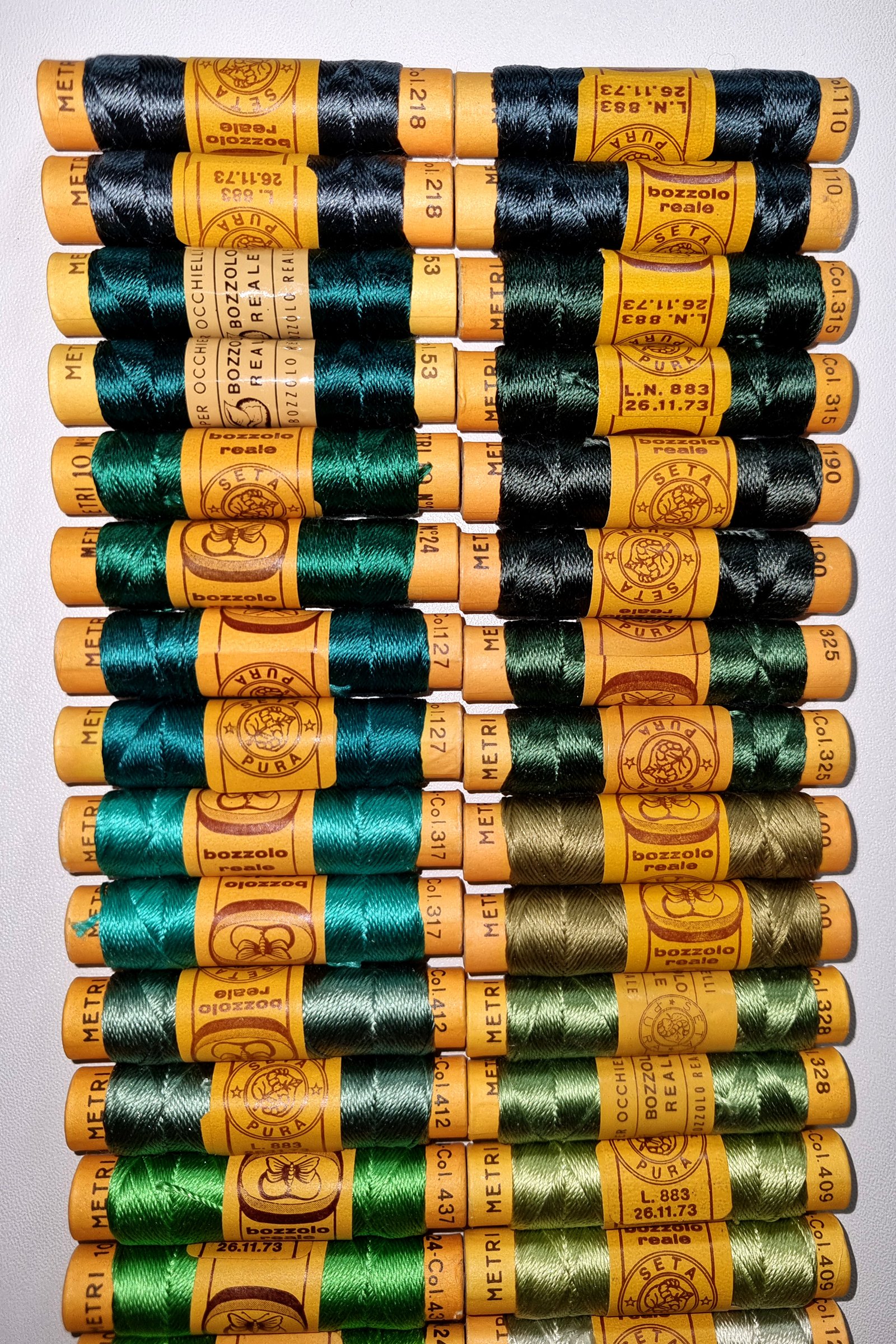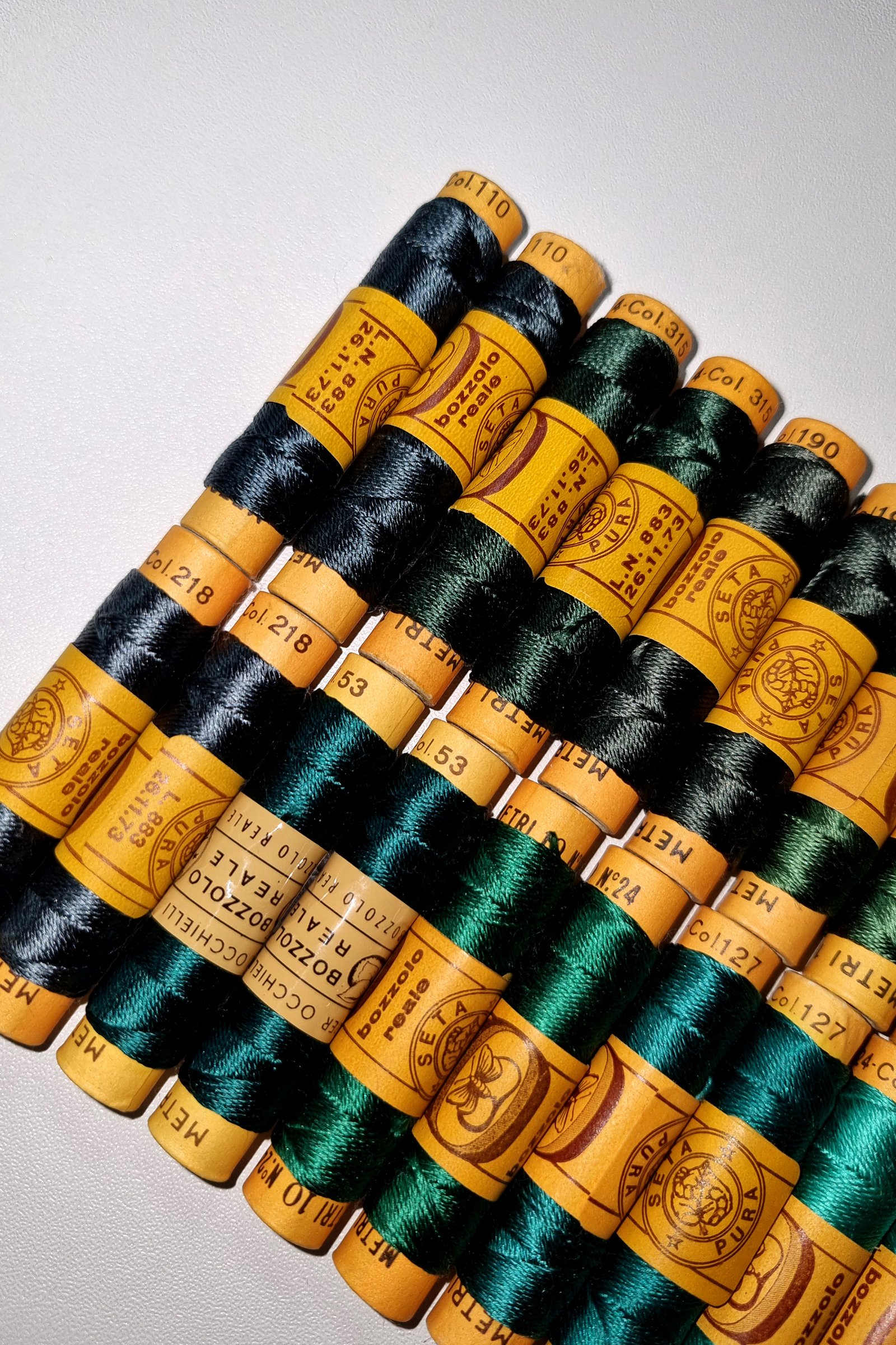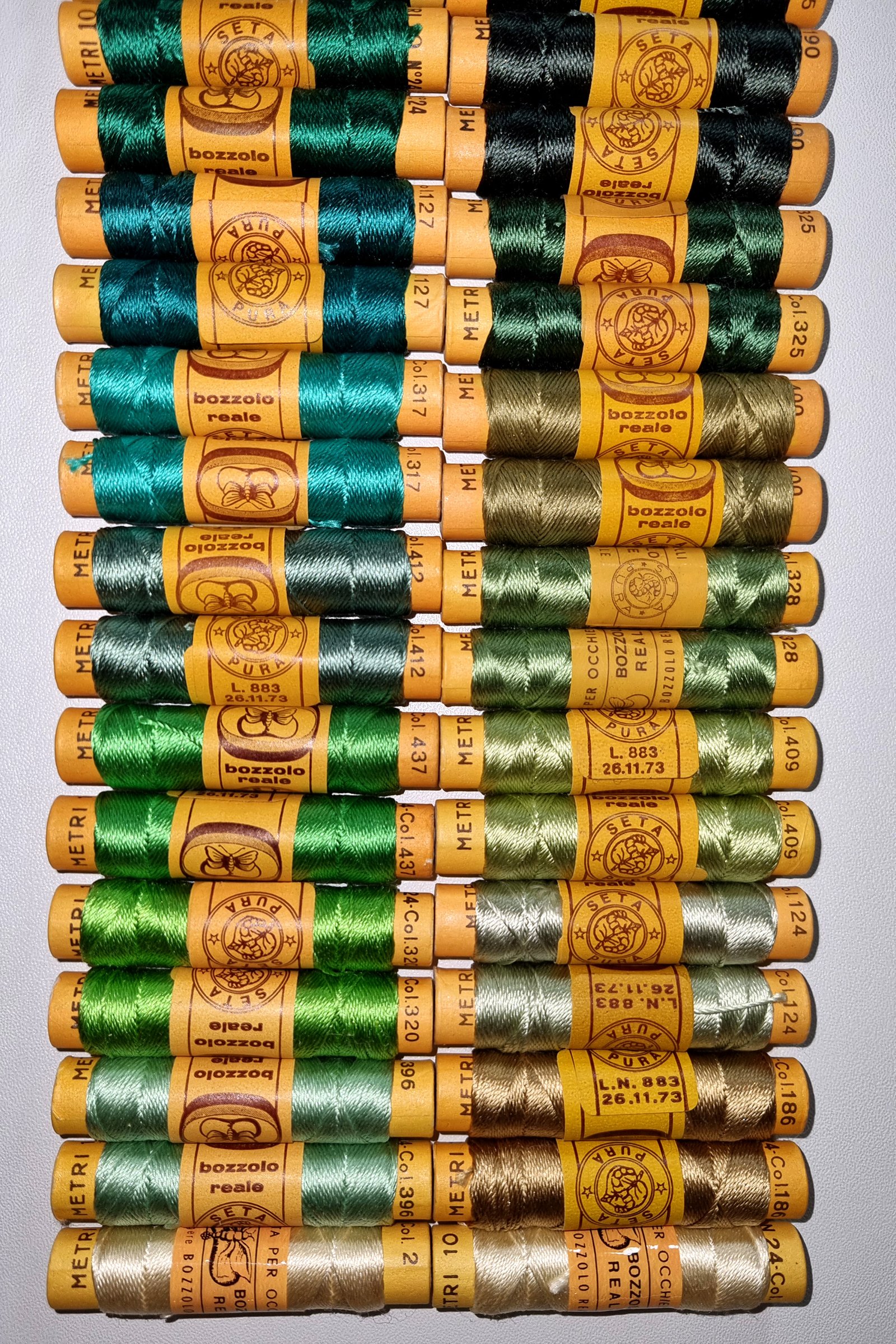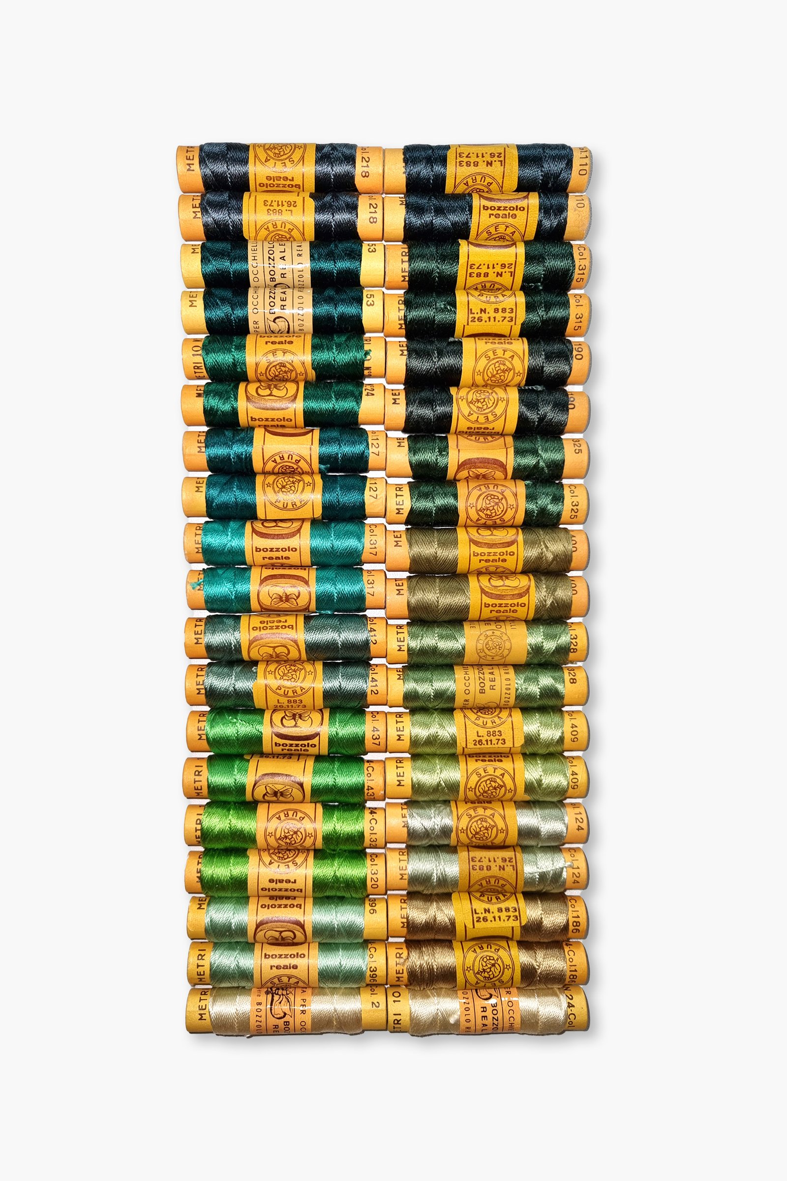 Vintage Silk Embroidery Thread Collection – Silk Botanical Green Shades – 38 Spools – 100% Silk – 10 m Each – Original Card Spools – Made in Italy by Cucirini Bozzolo Reale Tre Stelle