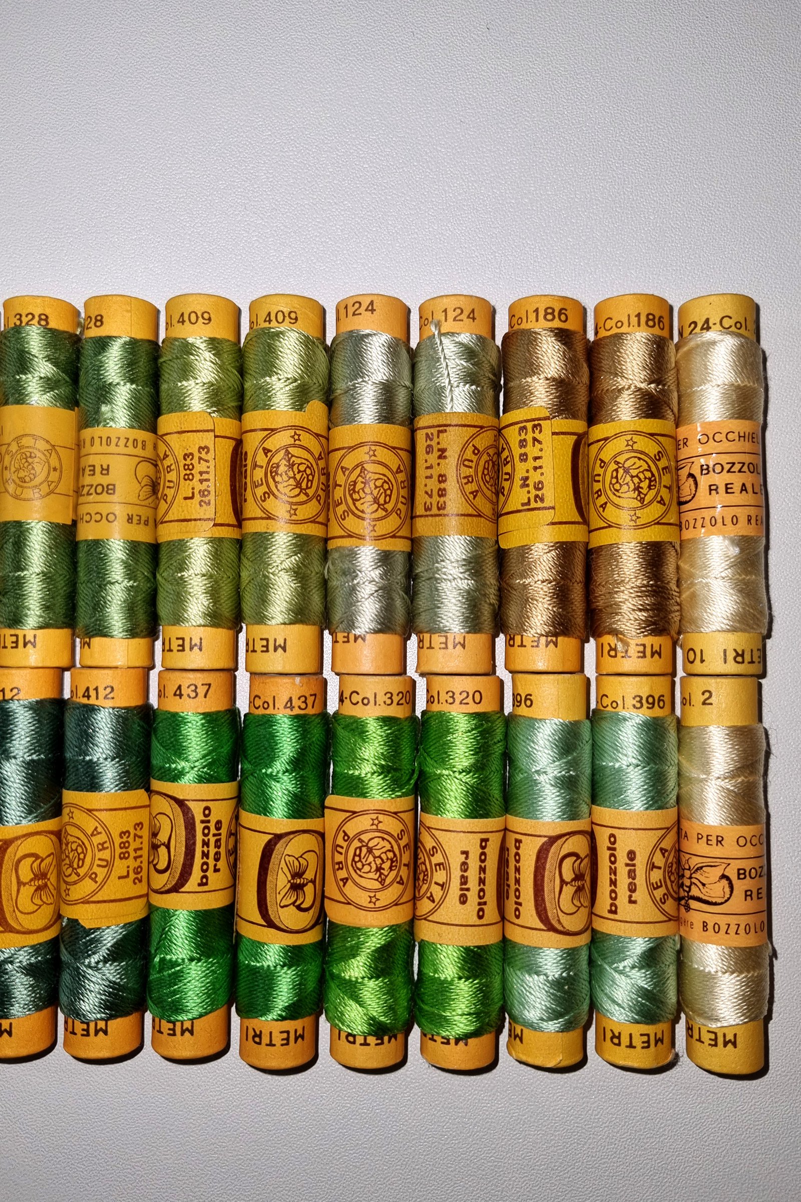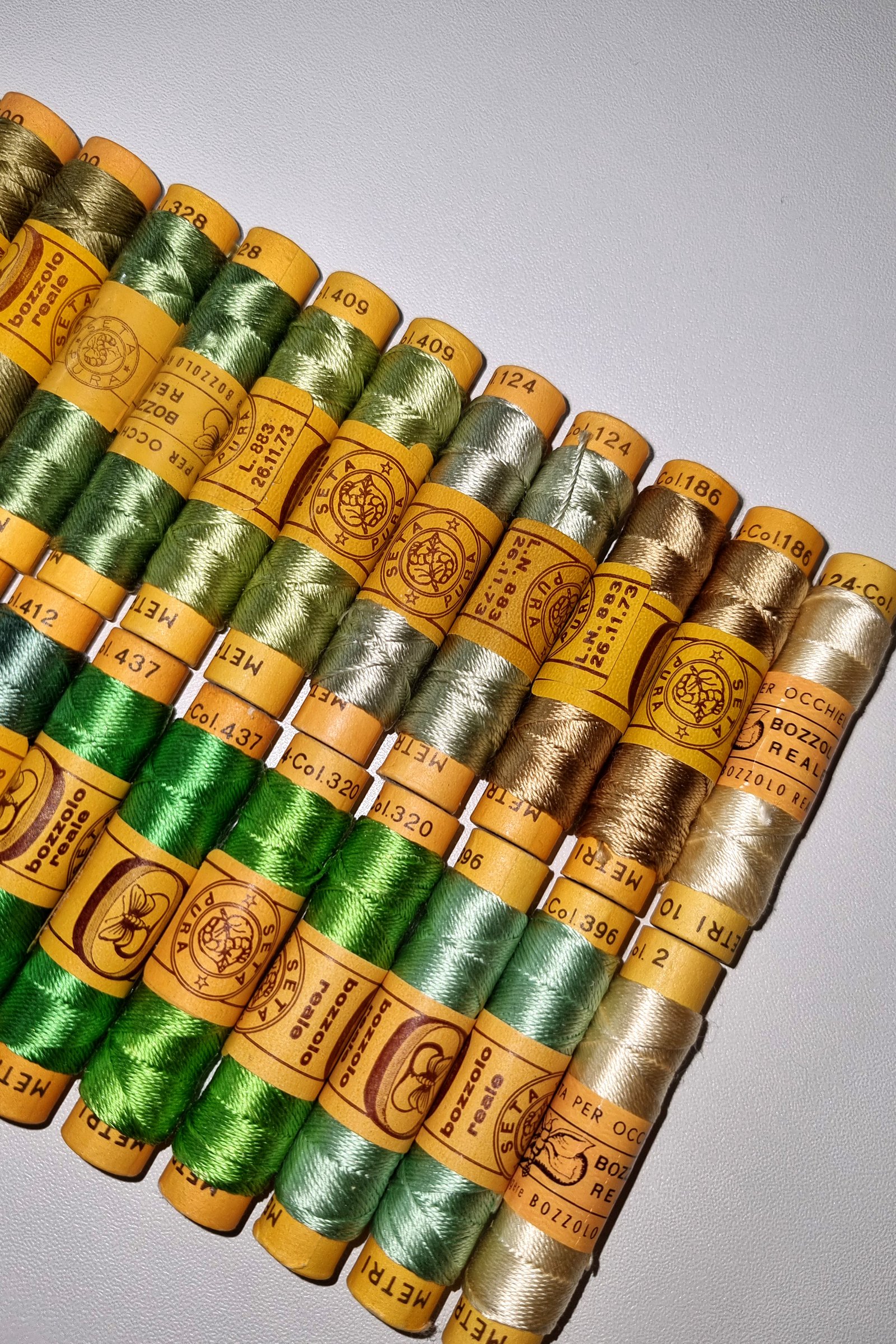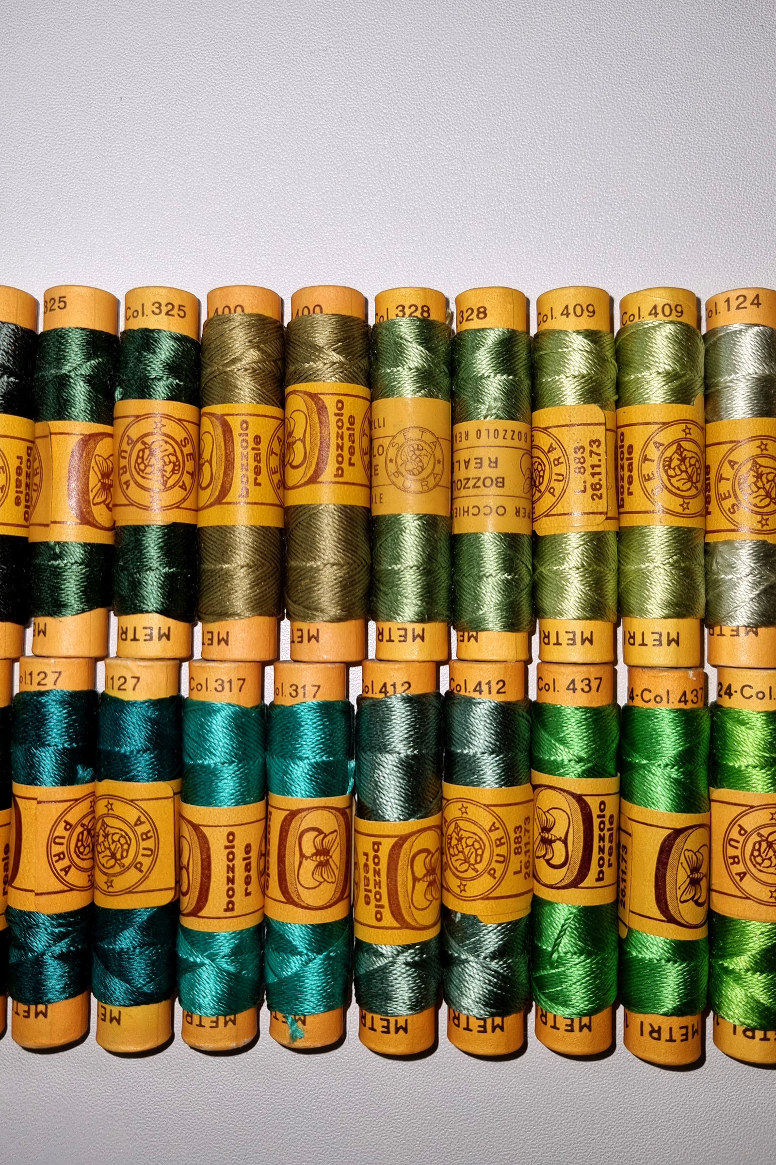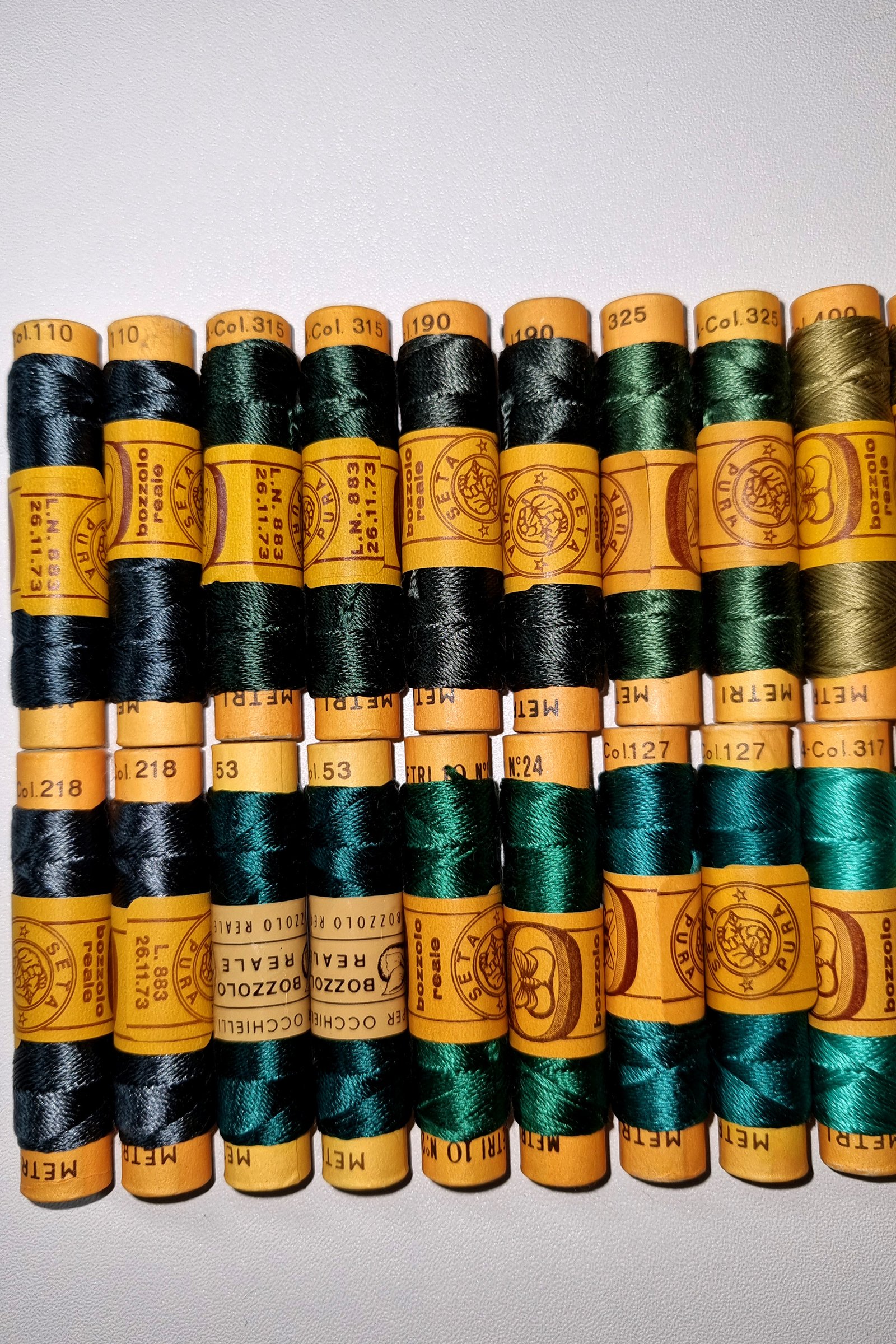 Vintage Silk Embroidery Thread Collection – Silk Botanical Green Shades – 38 Spools – 100% Silk – 10 m Each – Original Card Spools – Made in Italy by Cucirini Bozzolo Reale Tre Stelle
