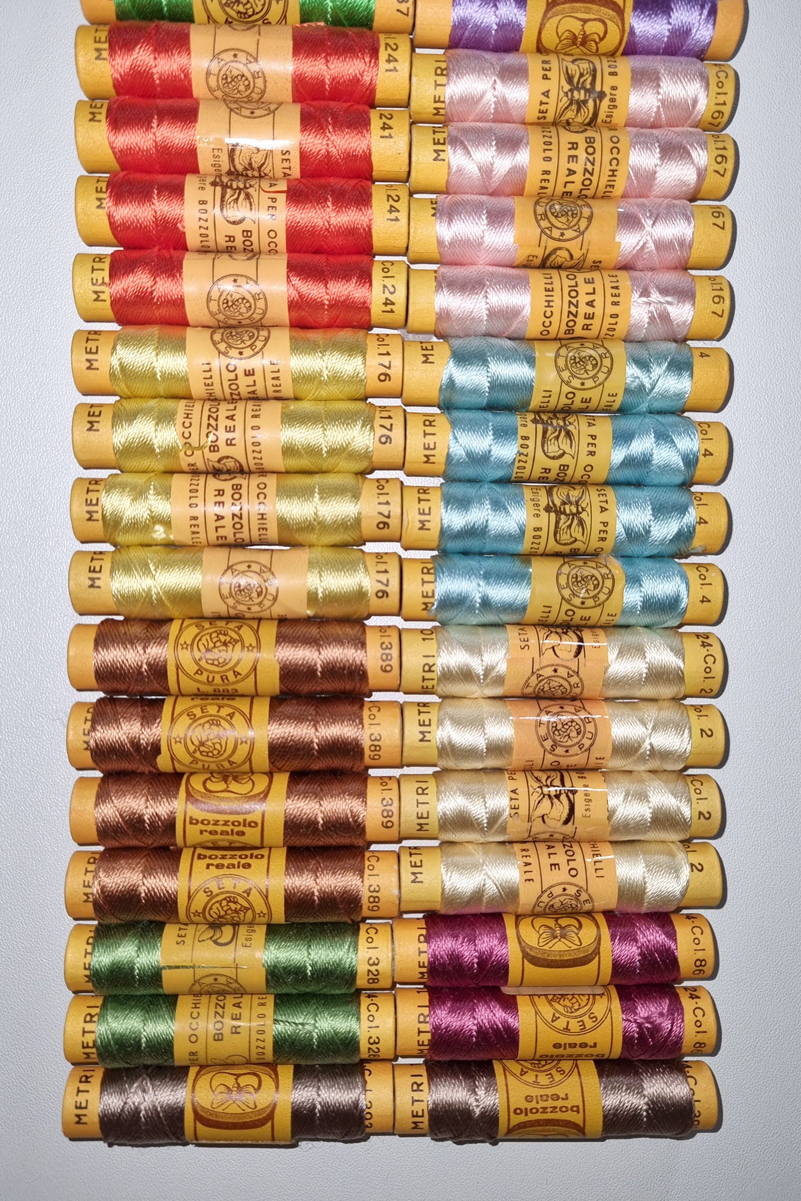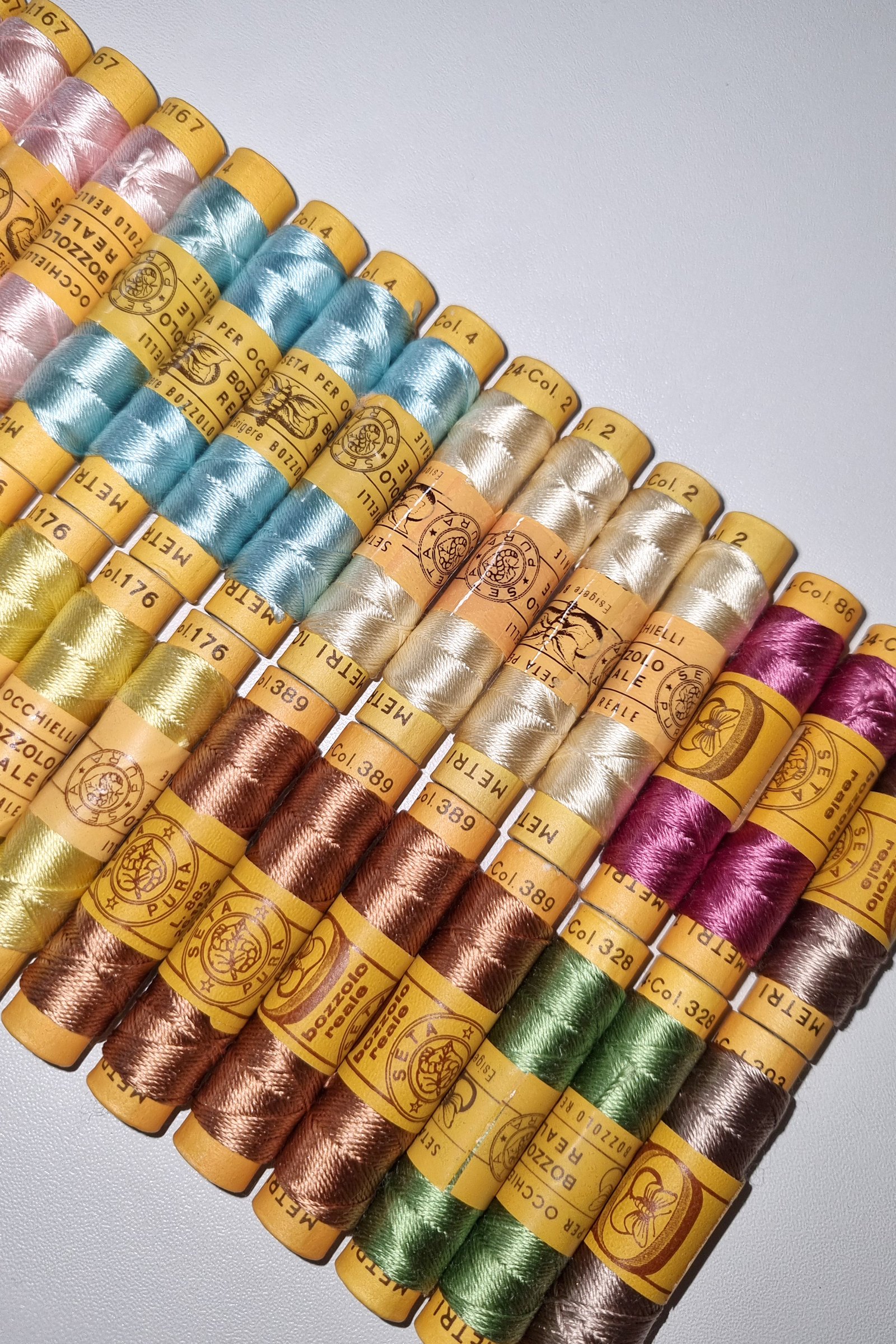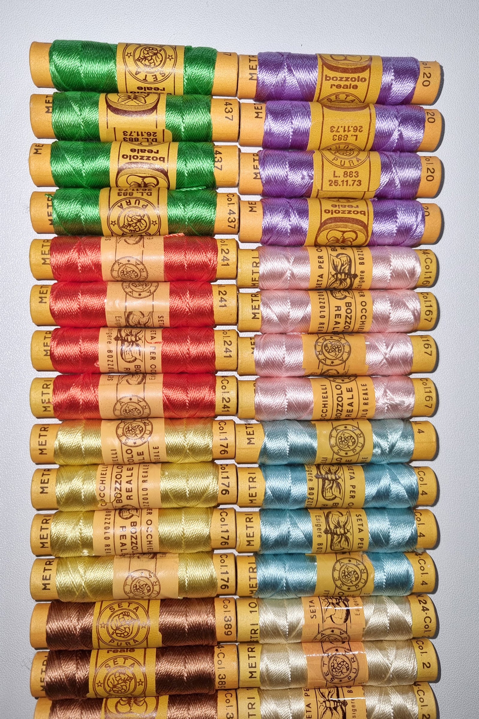 Vintage Silk Embroidery Thread Collection – Silk Water Lilies – 38 Spools – 100% Silk – 10 m Each – Original Card Spools – Made in Italy by Cucirini Bozzolo Reale Tre Stelle