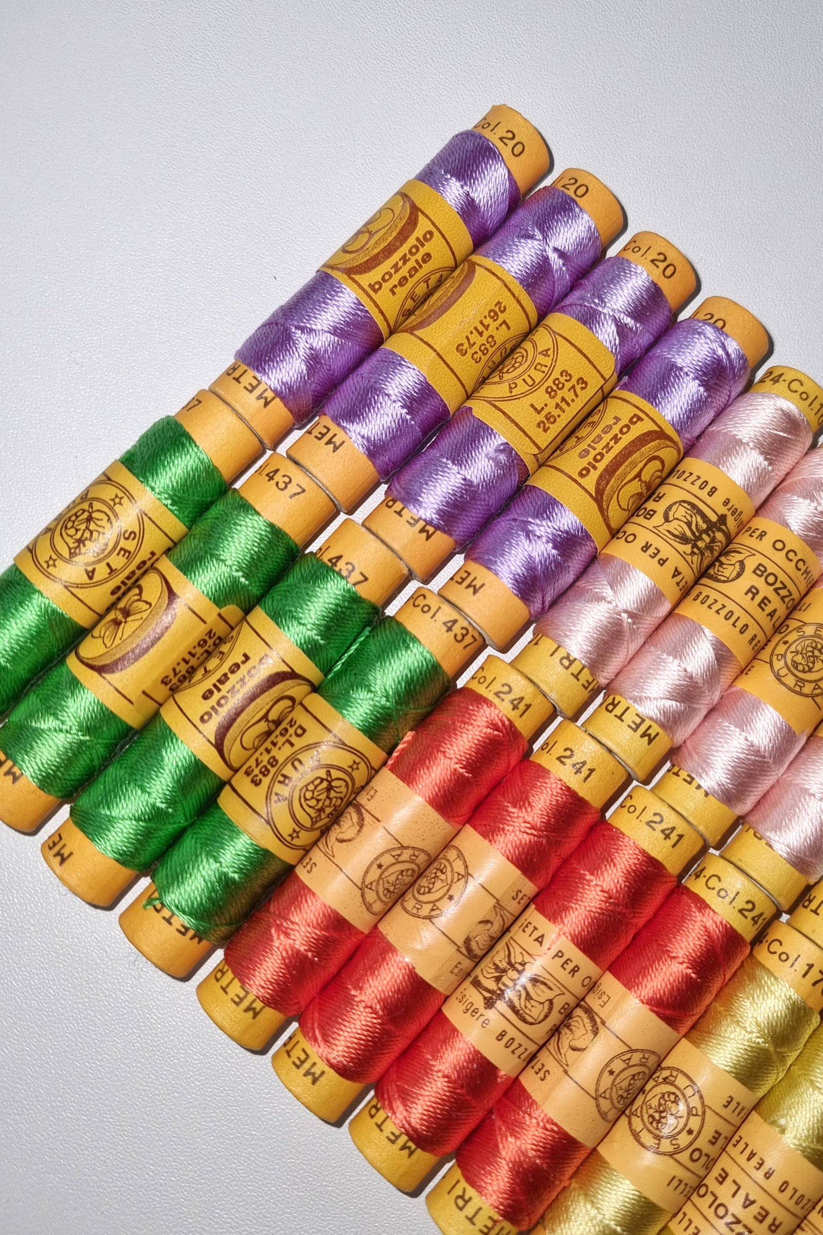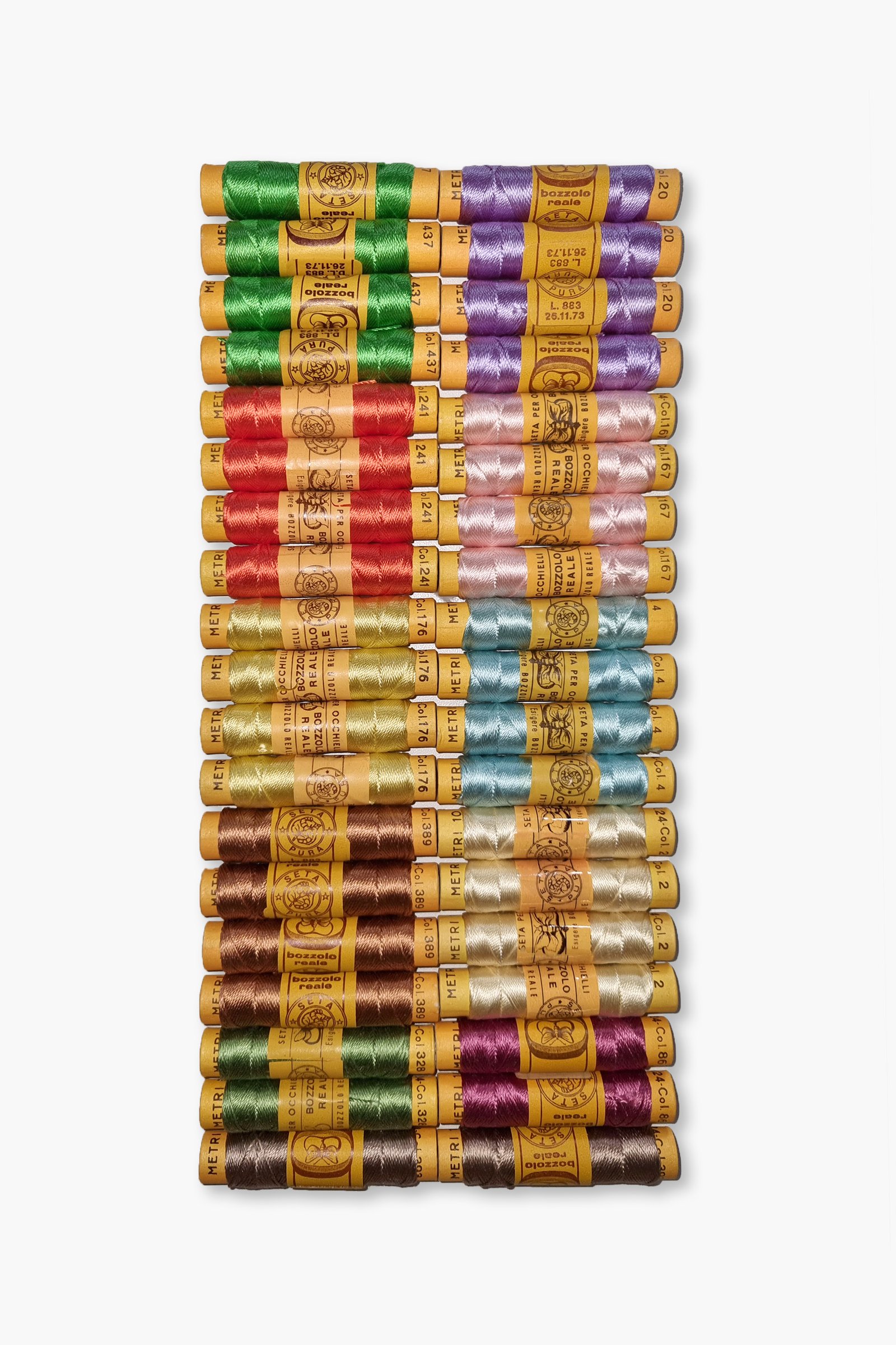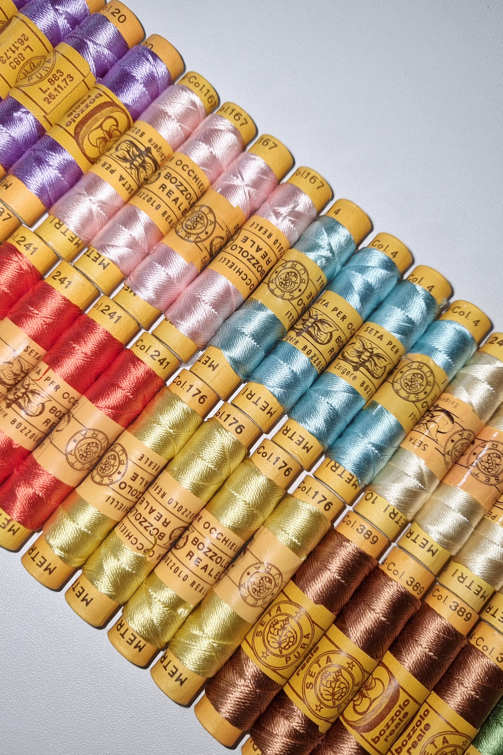 Vintage Silk Embroidery Thread Collection – Silk Water Lilies – 38 Spools – 100% Silk – 10 m Each – Original Card Spools – Made in Italy by Cucirini Bozzolo Reale Tre Stelle