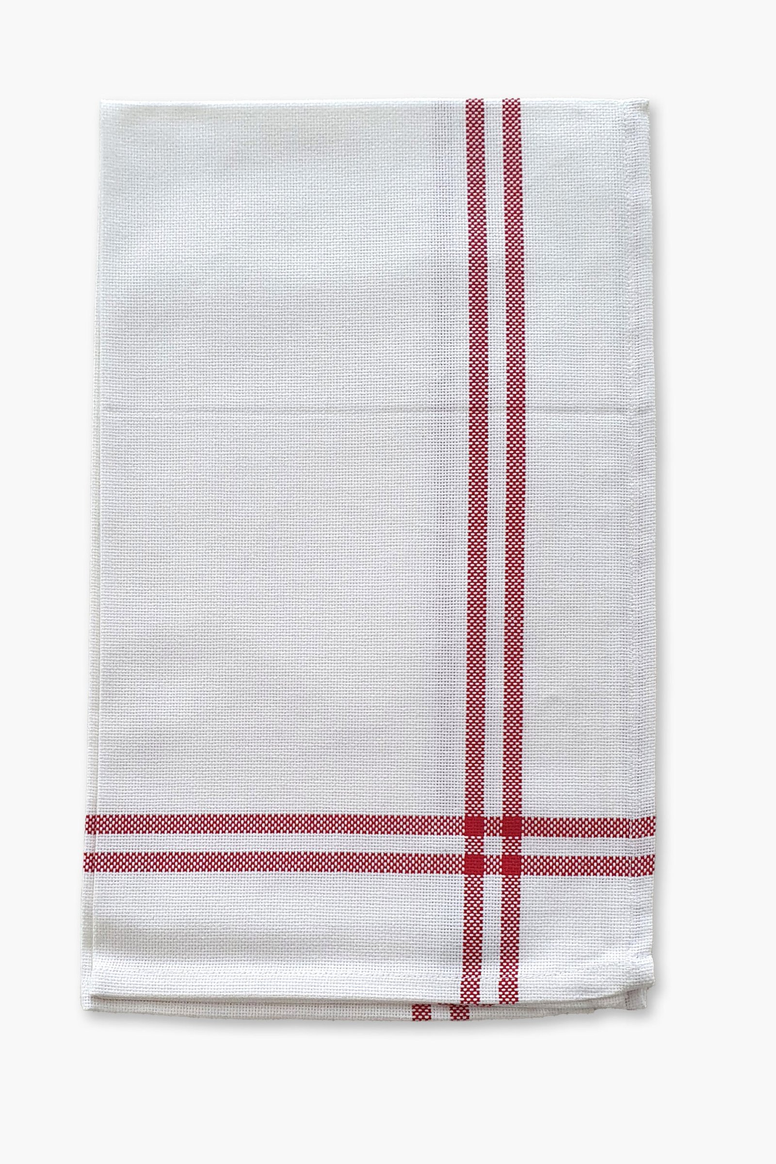 This kitchen towel is made from 100% Italian cotton and features a crisp white base with subtle red stripes. The full-surface Aida weave (8 stitches/cm) allows for embroidery across the entire towel, giving you freedom to create patterns, monograms, or other designs.