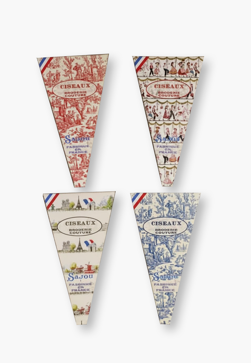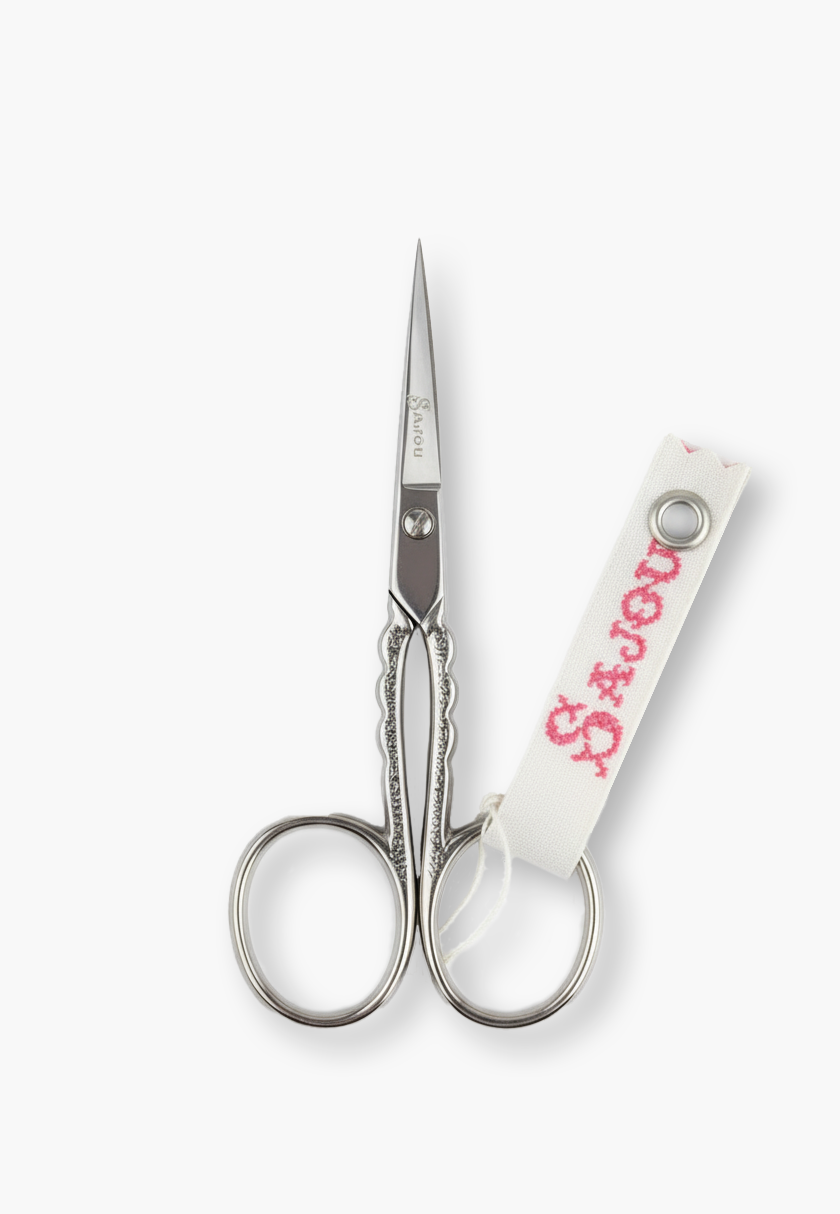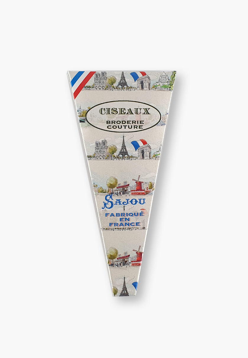 Elegant small embroidery scissors in chromed steel, featuring a delicate scallop motif on the handles. Perfect for beginners, they come in a foldable cardboard case decorated with a print inspired by a Sajou fabric (motif may vary by stock). Simply remove the label on the back to reuse the case. Scissors measure 8.9 cm in length and bear the authentic Sajou logo on the upper blade.