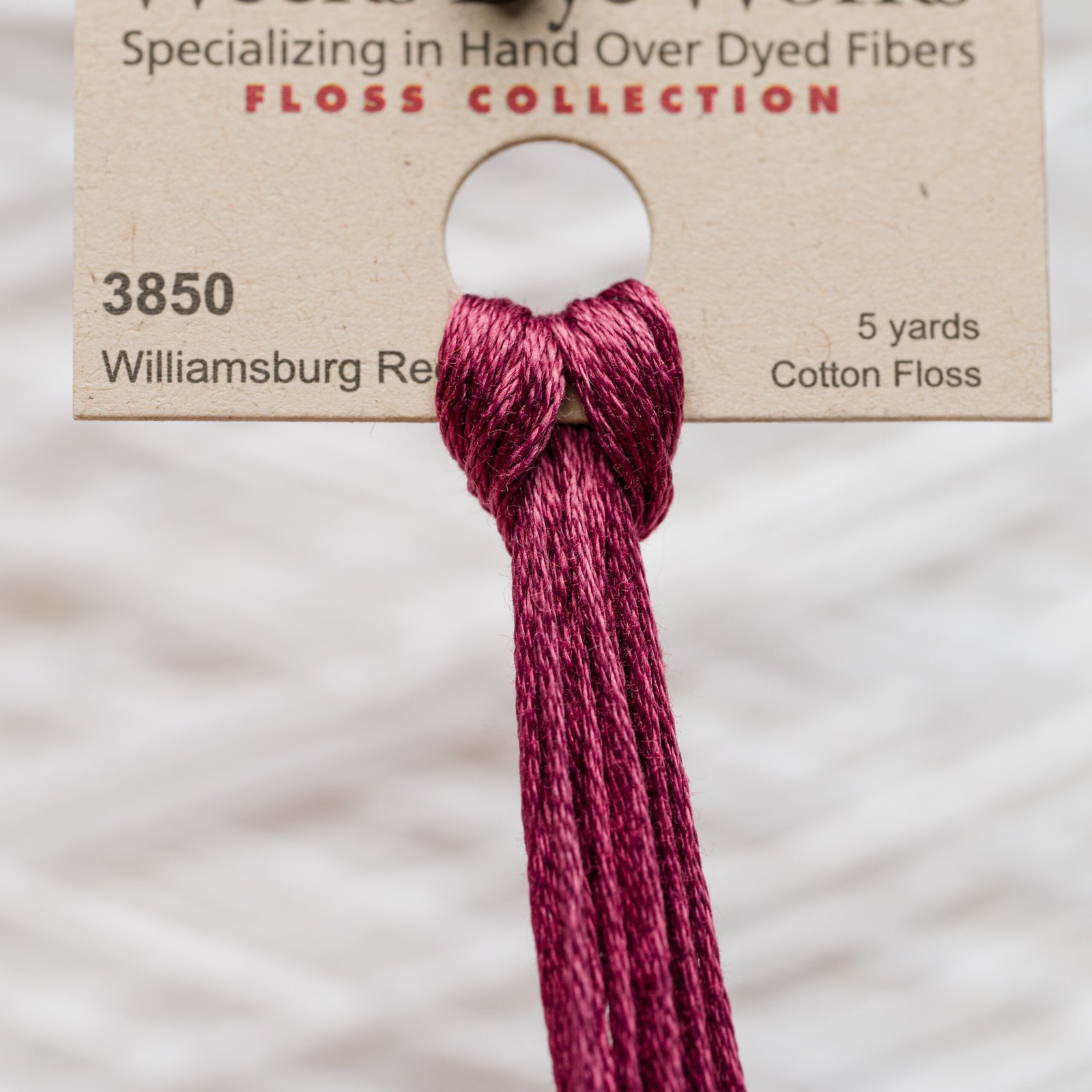 Weeks Dye Works 3850 Williamsburg Red is a premium hand over-dyed 100% Egyptian cotton embroidery floss with a soft natural sheen and rich, saturated colors. Each skein comes in a single continuous 5-yard length (not pre-cut), allowing you to separate strands as needed for your project.